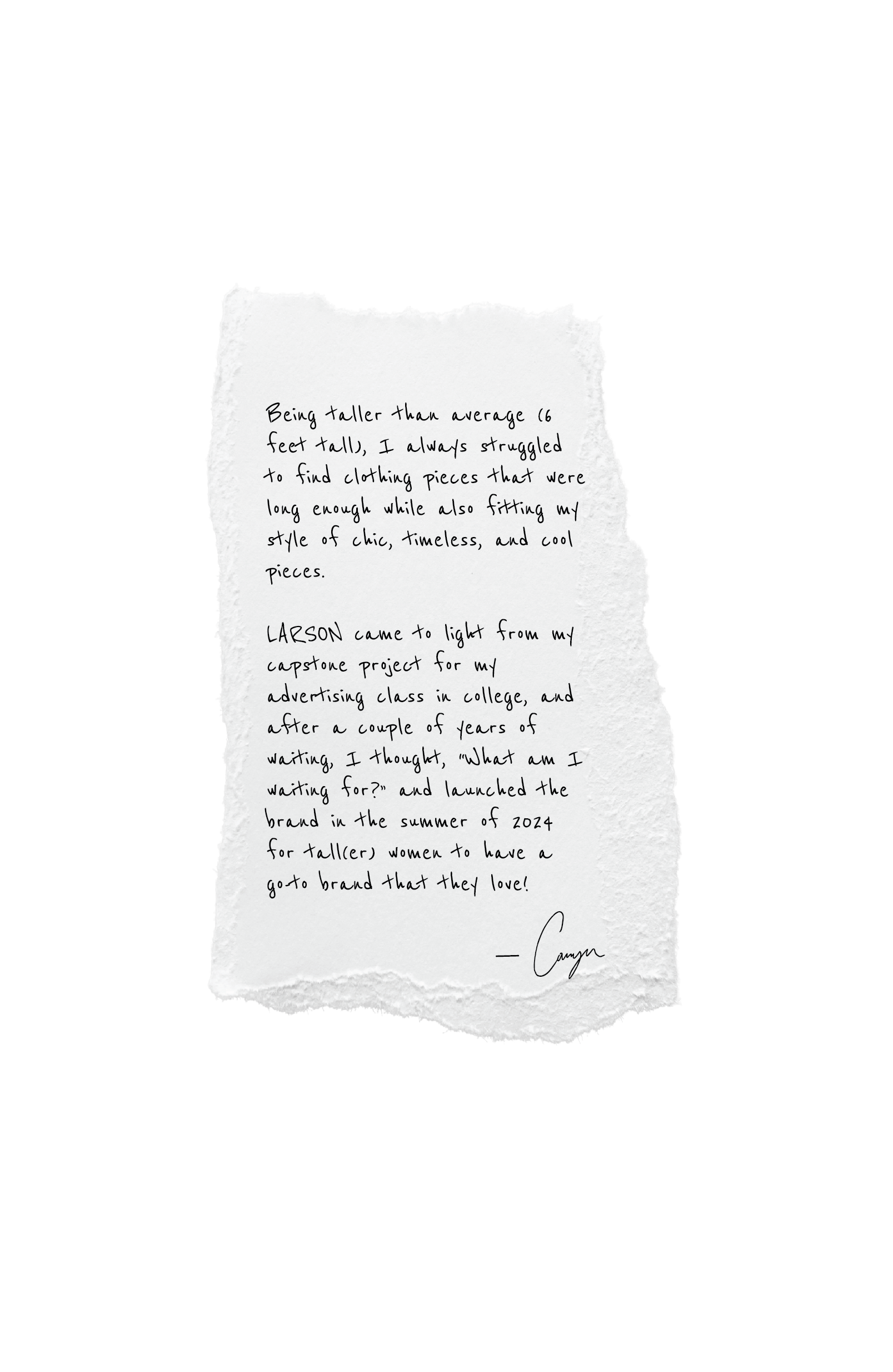 With LARSON, tall(er) women can finally experience that “where has this been all my life” moment. LARSON wants women to feel seen, heard, and able to FINALLY buy clothes that fit their body and style.
